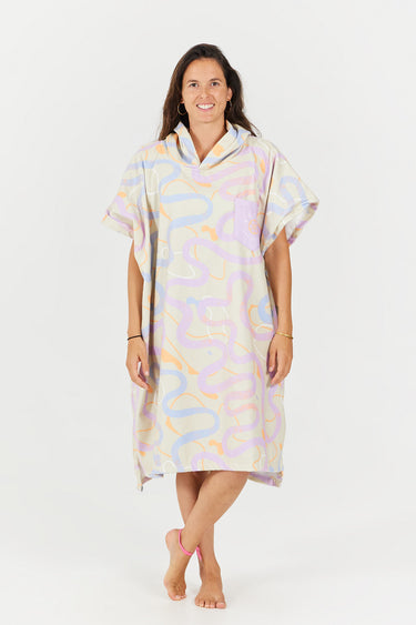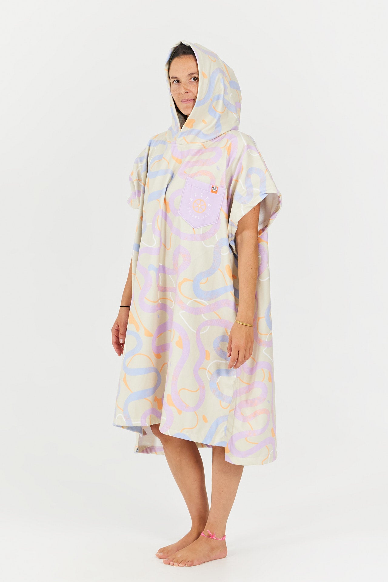 The RoadBike changing poncho from the Outdoor Series is inspired by cycling and adventure enthusiasts. Its stylized, colorful winding road patterns on a sand-colored background evoke bike rides, long mountain climbs, and the pleasure of carving your own line through outdoor landscapes.