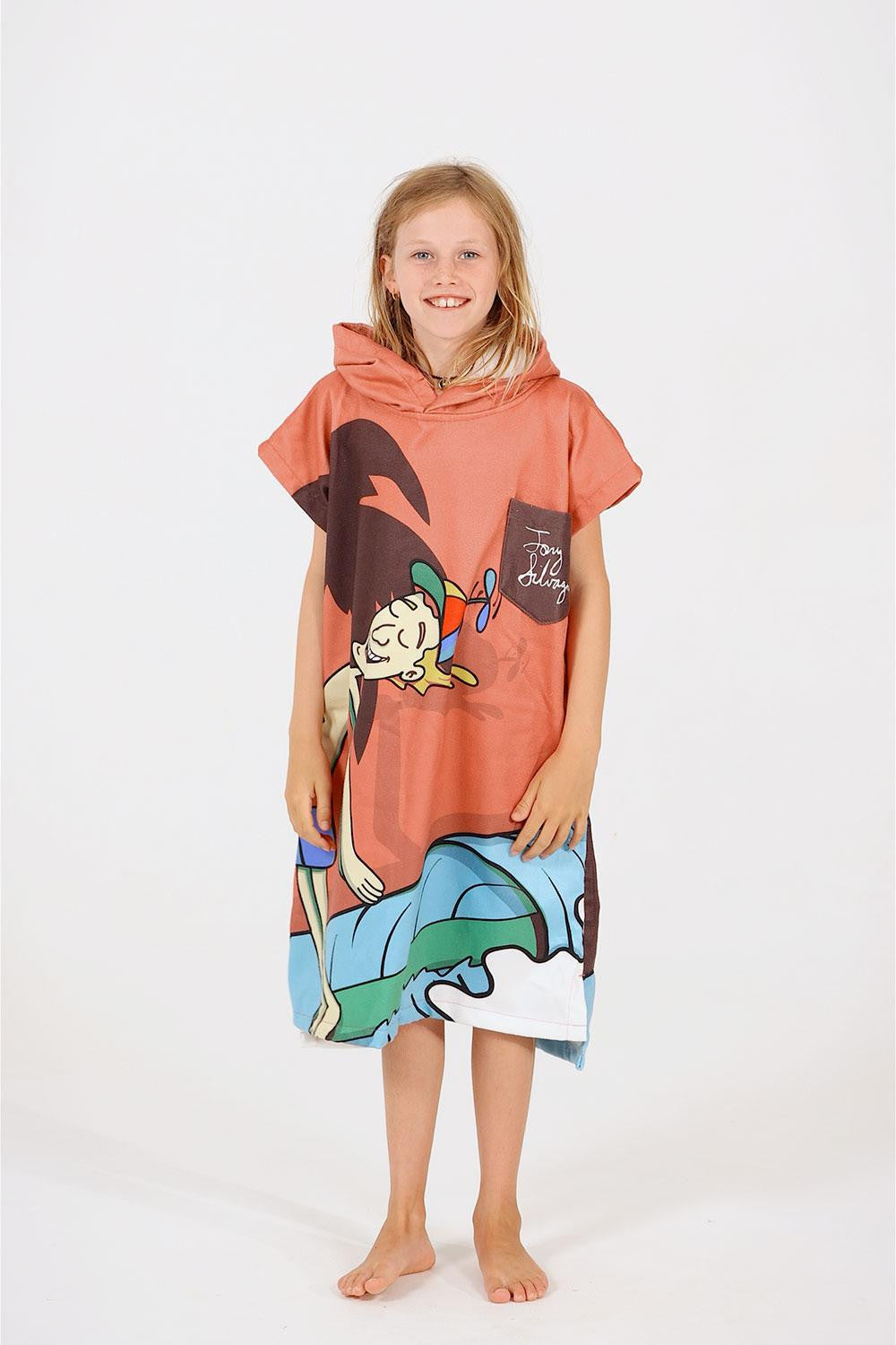 For the kids’ version of his Pro Model, American longboarder Tony Silvagni designed a poncho that reflects his personality and pays tribute to longboarding in a fun, cartoon style. Featuring a caricature of Tony, smiling mid hang ten, this design is full of good vibes.