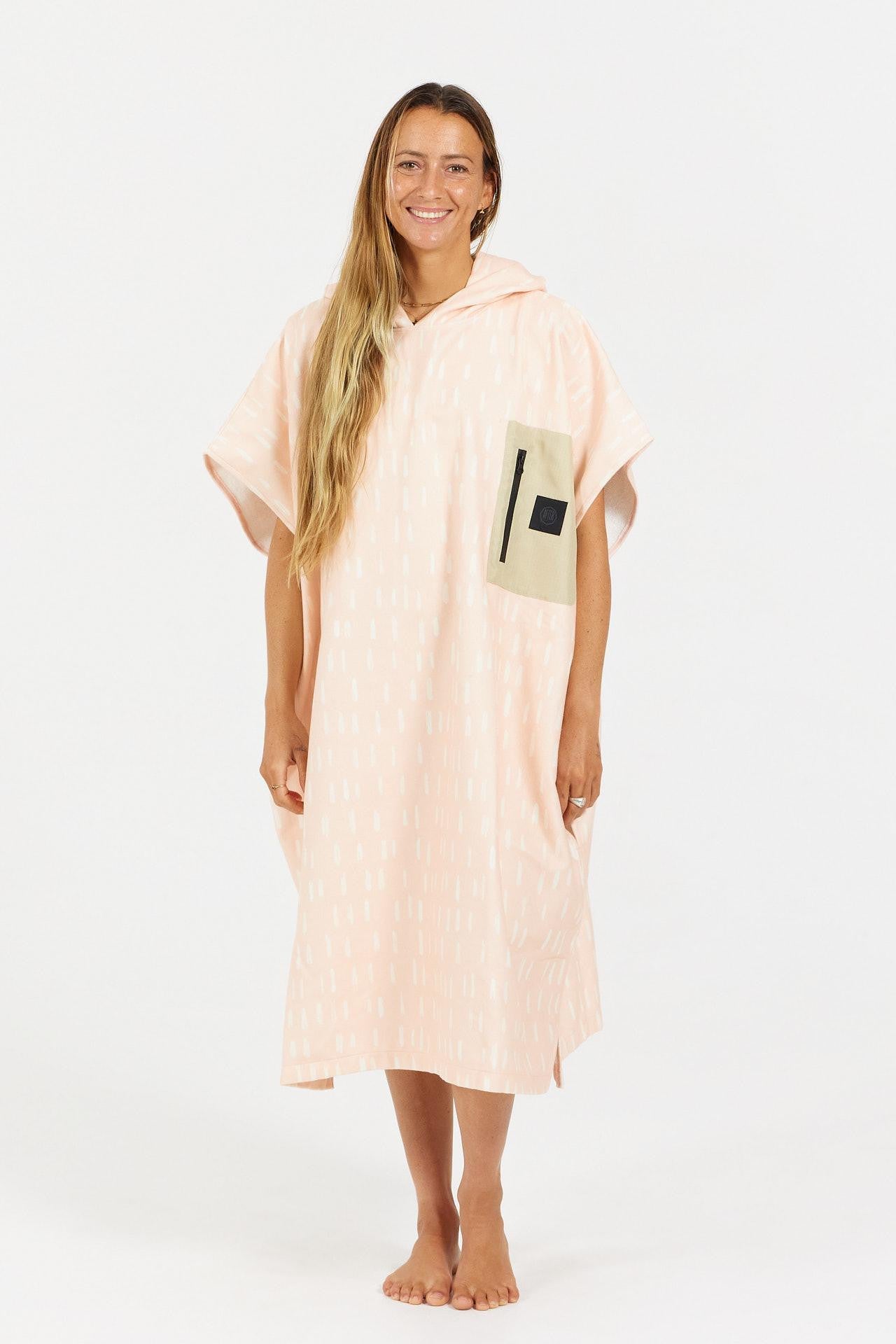 The Tech Pocket Tears of Pink poncho features a delicate all-over print of small stylised droplets on a soft pale pink background, bringing a sense of elegance and gentleness. Made from ultra-absorbent terry fabric, it ensures quick drying after a swim or a surf session.